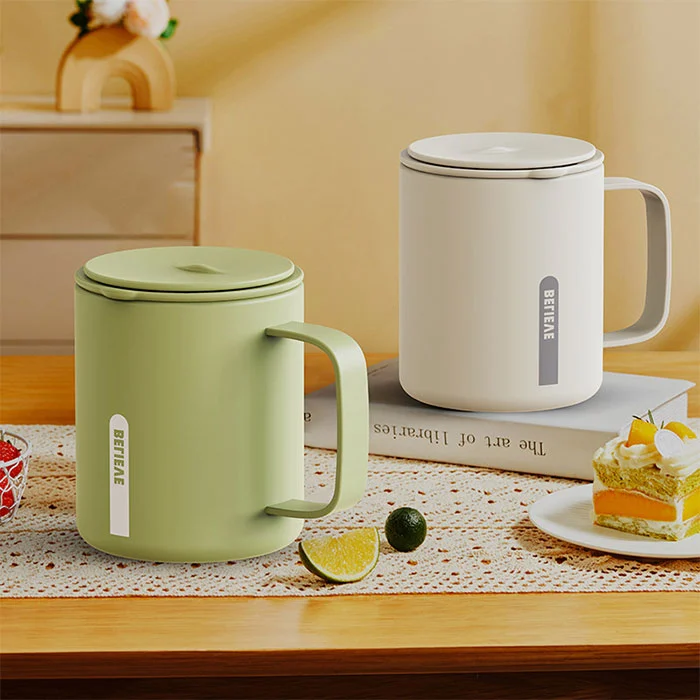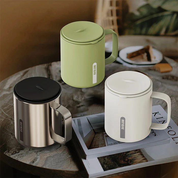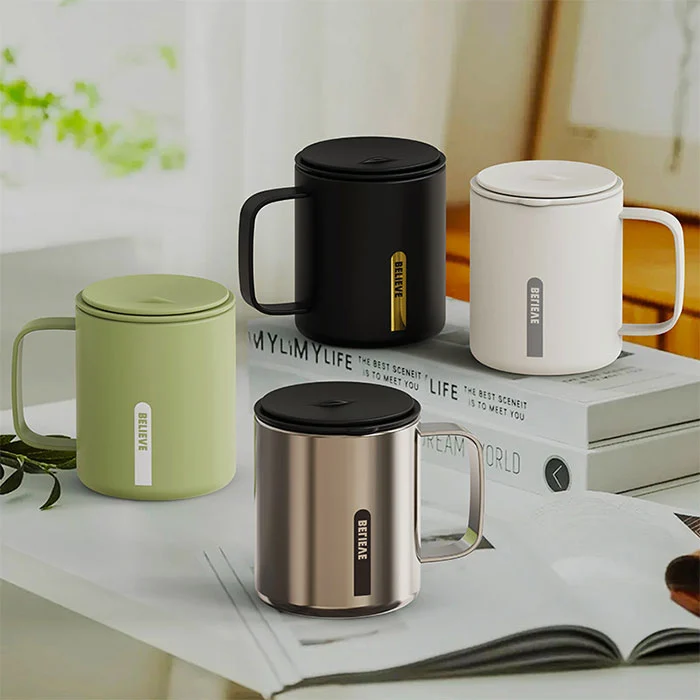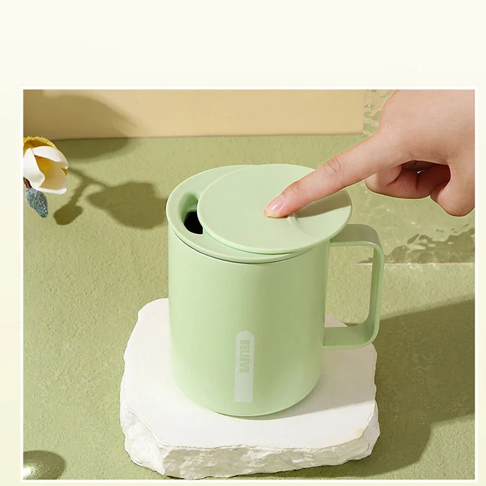 Ficar sentado no escritório por longos períodos enquanto bebe água, a abertura da tampa com um clique não atrapalha o trabalho, proporcionando isolamento e resfriamento, adequado para café e chá;
